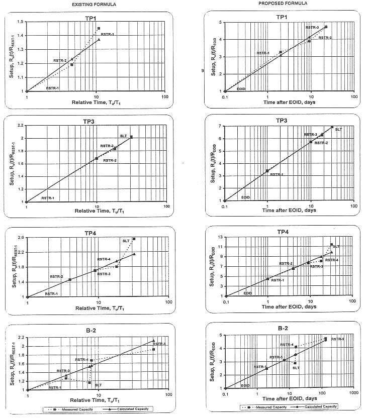 Pile capacity calculation according to formula (1) was made by Svinkin et al. (1994). Quantity, t1, was equal to 2 days for piles TP1 and 1 day for piles TP3 and TP4. Measured data and results calculated in accordance with the existing formula have been plotted in ordinates Ru(t)/RRSTR-1 and log10(t/t1) as broken and straight lines, respectively, in Figure 1. Note that the set-up coefficients from the field tests generally match well to those obtained from the existing formula.