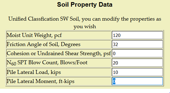 Finally, depending upon the choice of a free or fixed head, you are given the option of entering lateral loads and/or moments for the pile head.  In this case we have opted to add a lateral load of 10 kips to the pile and no moment.  The default is zero for both load and moment; this will produce some coefficients but no result for lateral loading.