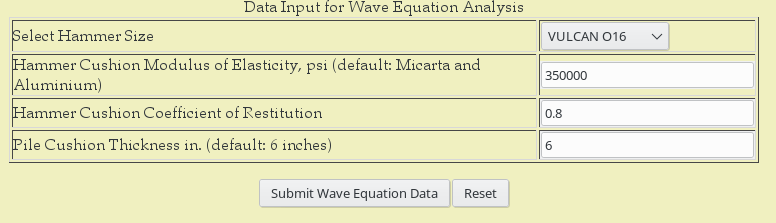 Most of the data required has been carried over from the static analysis.  The hammer database was added in 2010; however, it was reordered in ascending rated striking energy order and a hammer was suggested using the “initial guess” criterion in the Soils and Foundations Handbook, which essentially suggests to set the initial hammer energy in ft-lbs at 8% of the ultimate capacity in pounds.  This is a “rule of thumb” designed to help students who, faced with a wave equation program for the first time, will have some idea of where to start, although there is no guarantee that the hammer will be either too large or small.  Since the energies are sorted, the user can move up or down the list to try another hammer.