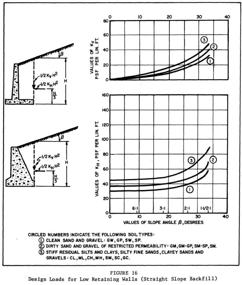 Practitioners who design gravity retaining walls are familiar with the existence of Terzaghi’s “low walls” curves to estimate the equivalent fluid pressure on the wall, horizontal and vertical. The basic chart comes in several versions but the one (for straight backfill) from NAVFAC DM 7.02 is above. The explanation for it (important when one is using it) is below.