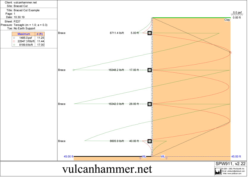 Let us consider a braced cut excavation which is 45′ deep and which has supports at a depth of 5′, 17′, 28′ and 40′. The soil behind the wall is uniform with c = 1100 psf and γ = 110 pcf. The water table is at the bottom of the excavation and does not enter into our calculations. To show how this lays out we’ll use Pile Buck’s SPW 911 sheet pile software. We’ll assume PZ-27 sheeting is being used, and that there is no surcharge on the wall.