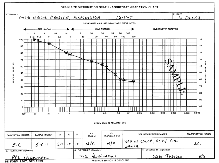 One of the core things students learn in a basic Soil Mechanics course is how to analyze and chart the results of sieve tests on soils. Texts such as Soils and Foundations Reference Manual and Verruijt, A., and van Bars, S. (2007). Soil Mechanics. VSSD, Delft, the Netherlands. usually present the concept but don’t always give a detailed explanation of how these things are actually analyzed. The example below is from Materials Testing and is based on the use of their forms DD-1206 and DD-1207, which of course we furnish as well.