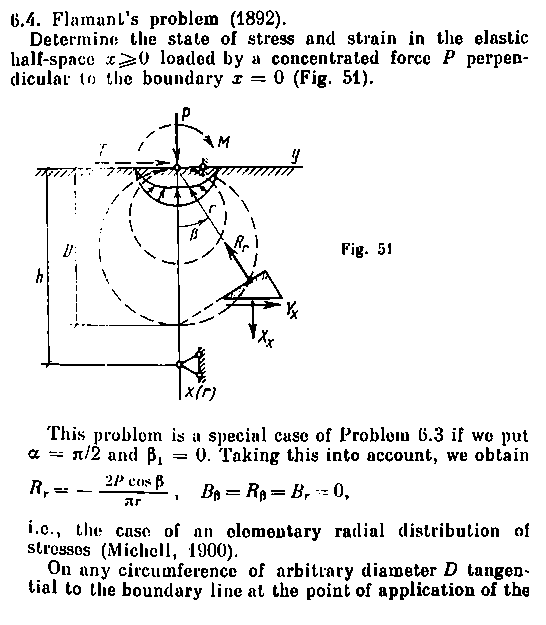 The same situation exists with a line load, the elastic solution usually attributed to Flamant. The solution itself also presented in NAVFAC DM 7.01 and Arnold Verruijt’s Soil Mechanics. The derivation is presented below, and comes from the Manual of the Theory of Elasticity, by V.G. Rekach. Some discussion of similar solutions is in my post Analytical Boussinesq Solutions for Strip, Square and Rectangular Loads and my class presentation is at Soil Mechanics: Elastic Solutions to Soil Deflections and Stresses.