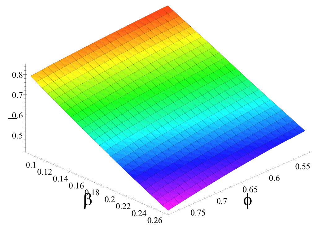 A quick comparison was made by dividing the right hand side of Equation (3, numerator) by the right hand side of Equation (2b, denominator.) A survey of the results are shown below. The angles are shown on the x- and y-axes in radians; the friction angle varies from 30 to 45 degrees and the backfill angle