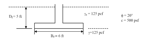 One important practical difference between the two is the way the overburden is handled. With the lower bound solution, it is equal to \gamma D , while with the upper bound solution it is simply the pressure q . For a uniform soil above the foundation base with no water table to complicate things, q = \gamma D = (125)(5) = 625\,psf .