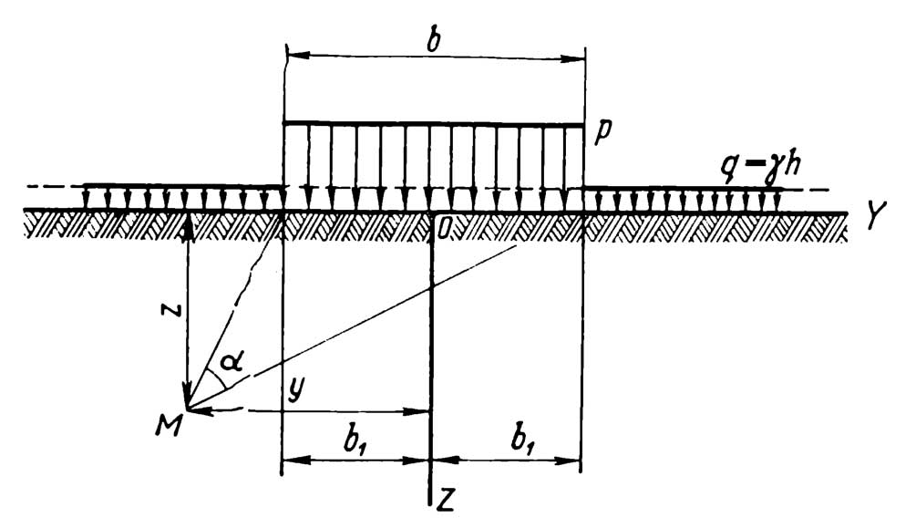 Figure 1 Elastic Model of Stresses of Strip Loads (adapted from Tsytovich (1976))