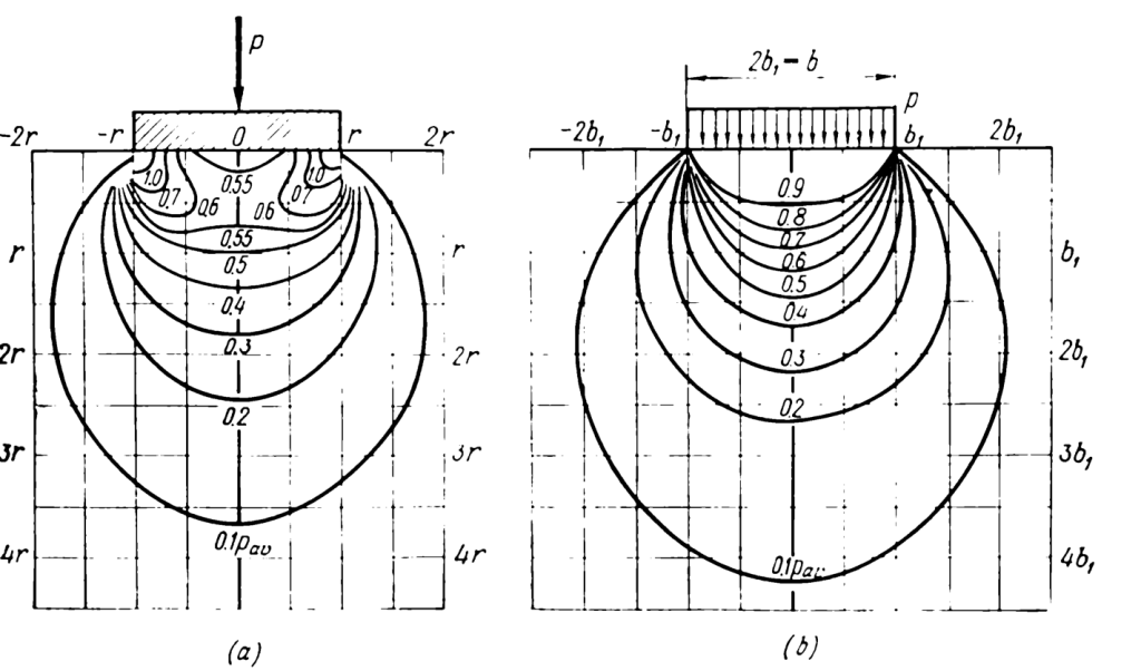 The figure (b) above shows different vertical stress distributions for different flexibility ratios, given by the variable . This can be approximated by the formula (Tsytovich (1976))