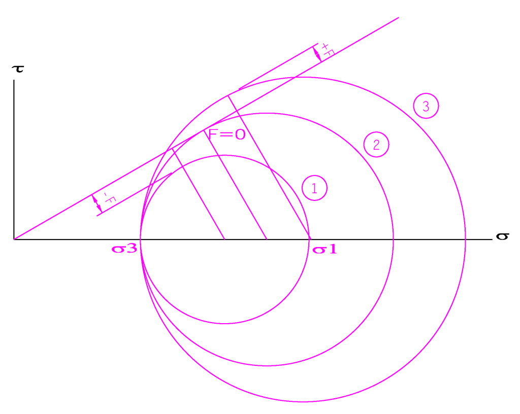 Failure takes place when Mohr’s Circle for the stress state either intersects or goes above the failure line. The state of intersection, in terms of the principal stresses, is expressed by Verruijt as