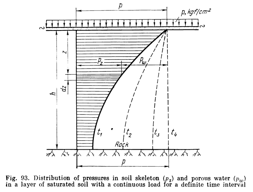 A basic assumption in consolidation theory is that, when the load at the surface is applied, all of this additional load is initially borne by the pore water pressure. Because of the aforementioned permeability, the water will want to “head for the exits,” i.e., the permeable boundaries of the layer being compressed. When the particles have rearranged themselves and the excess pore water has been squeezed out, the settlement should stop (until secondary compression kicks in.) During this process the load on the pore water is being progressively transferred to the soil particles until consolidation has stopped (which, in theory, it never does, as we will see) and the load is completely handed off to the particles.