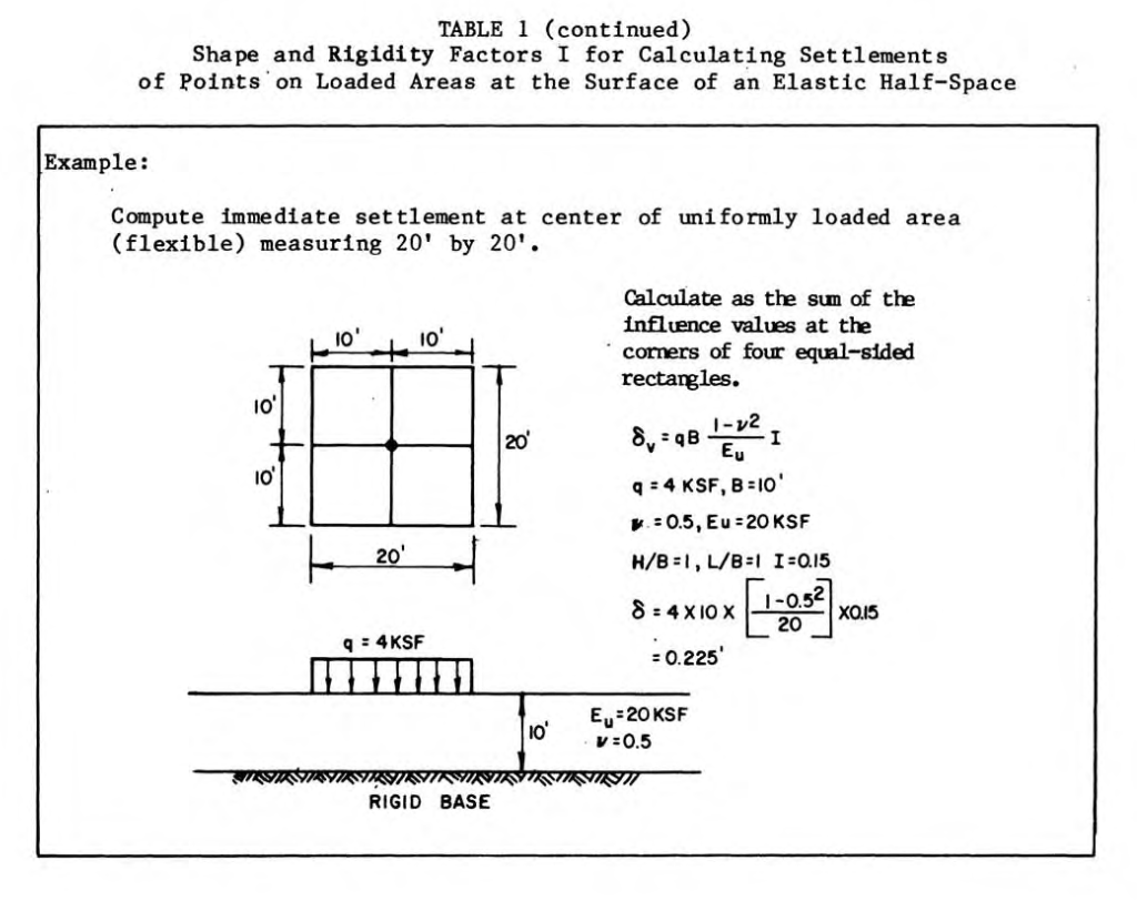 Note that we’re now dealing with settlements. The soil being compressed is limited to a height H from the surface to the “rigid base.” In this diagram we do this corner by corner, as we did for the stresses in Analytical Boussinesq Solutions for Strip, Square and Rectangular Loads. In both this and Going Around in Circles for Rigid and Flexible Foundations we used another chart, which is shown below.