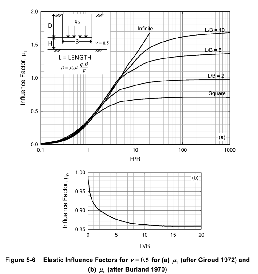 To start with, Figure 5-6 (and the accompanying text) really don’t say whether it’s settlement at the corners, centre or an average settlement. Giroud (1972), the source of Figure 5-6a, does say that it is a corner settlement similar in concept to the old DM 7.01, but the new document does not make this clear. From this, H/B = 10/10 = 1 and L/B = 1. Looking at the chart and summing the corner displacements of the partial foundations,