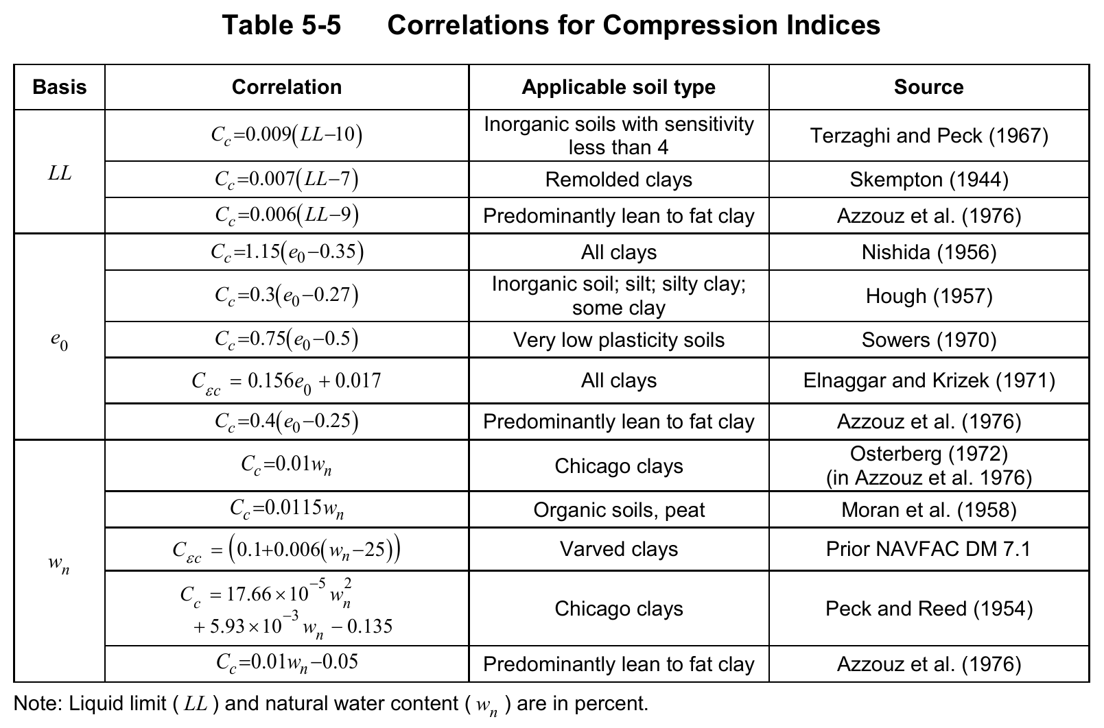 Whether we can dispense with the initial void ratio is a separate topic. Assuming that we can, what we have is a situation with three different compression coefficients, all designated with some form of , and none of them the same. (If we threw in natural logarithms, we’d have six.) The potential for confusion is evident, no where than when two of the three coefficients end up in the same table: