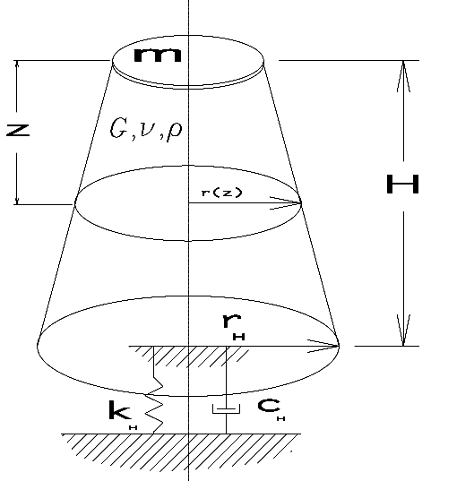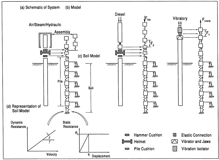 Such a model as shown above models both the shaft friction along the side of the pile and the toe resistance under the end of the pile. It has been customary over the years, however, for researchers and practitioners alike to model this resistance in a rheological way. This has been easier with the shaft than with the toe, because of the complexities of the dynamic elasto-plastic response of the soil at the toe and the difficulties of establishing failure surfaces in the soil has led to many solutions of the problem.