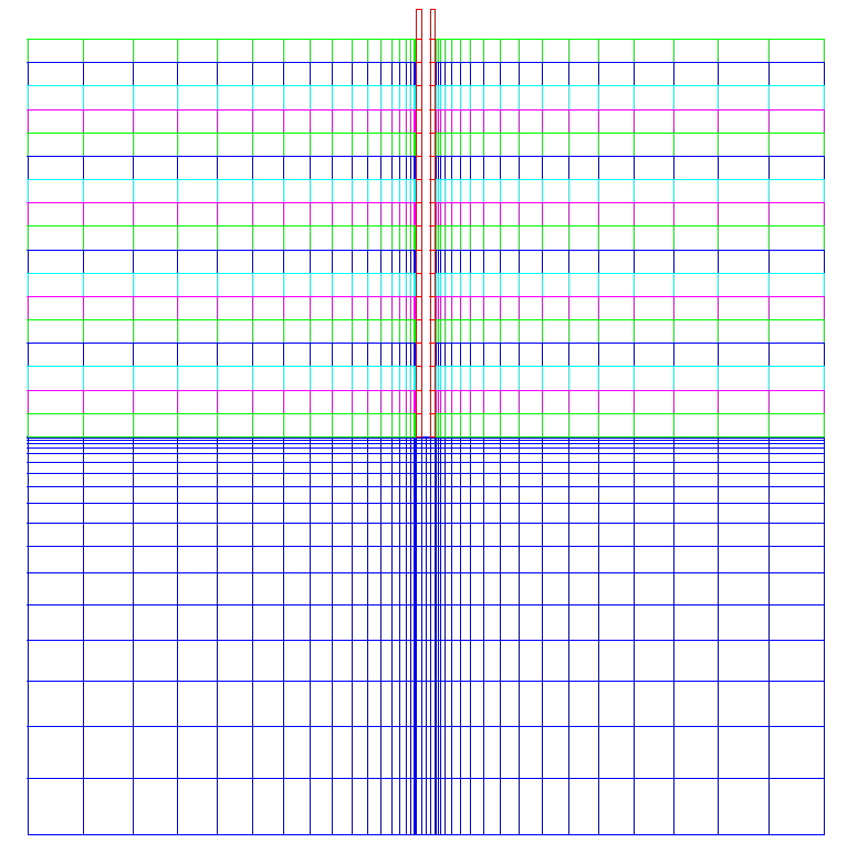An advance of this is the use of two- or three-dimensional elements in a finite element scheme, such as was featured in the earlier post Comments on “3D FE analysis of bored pile- pile cap interaction in sandy soils under axial compression- parametric study” and was analysed extensively in my dissertation Improved Methods for Forward and Inverse Solution of the Wave Equation for Piles. A cross section of that model is shown in Figure 2, from Inverse Analysis of Driven Pile Capacity in Sands: