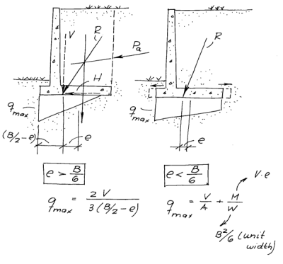 Knowing the location and magnitude of the resultant, we compute the maximum and minimum pressures on the base. Since both pressures are compressive, the resultant is in the middle third, and thus we can proceed with the base design.