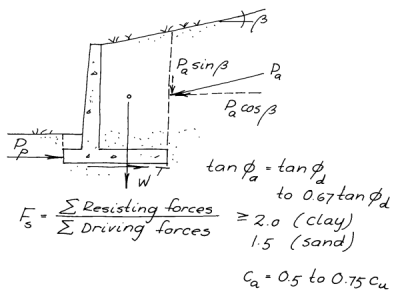 - The backfill force must be separated into horizontal and vertical components, as shown in the diagram above. The vertical component actually increases both the weight on the foundation and the resisting moment of the weight.