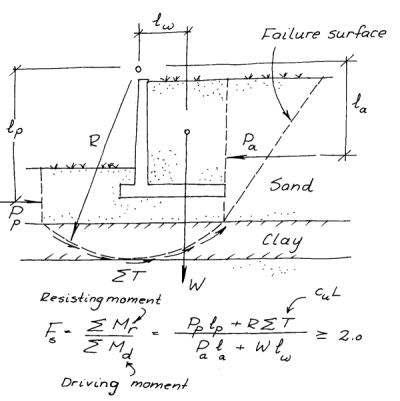 These days it’s more likely that a computer solution–be it a true finite element analysis or simply the automation of those tedious hand calculations–is used to finalise the design of a retaining wall. An example of such an analysis is shown above, and addresses in particular an issue that gets the short shrift in classical retaining wall analysis of any kind: global stability failure. An idea of a hand solution to this problem is shown at the right. Global stability failures still happen and are generally disastrous; beyond a conventional slope their analysis is fairly complex.
