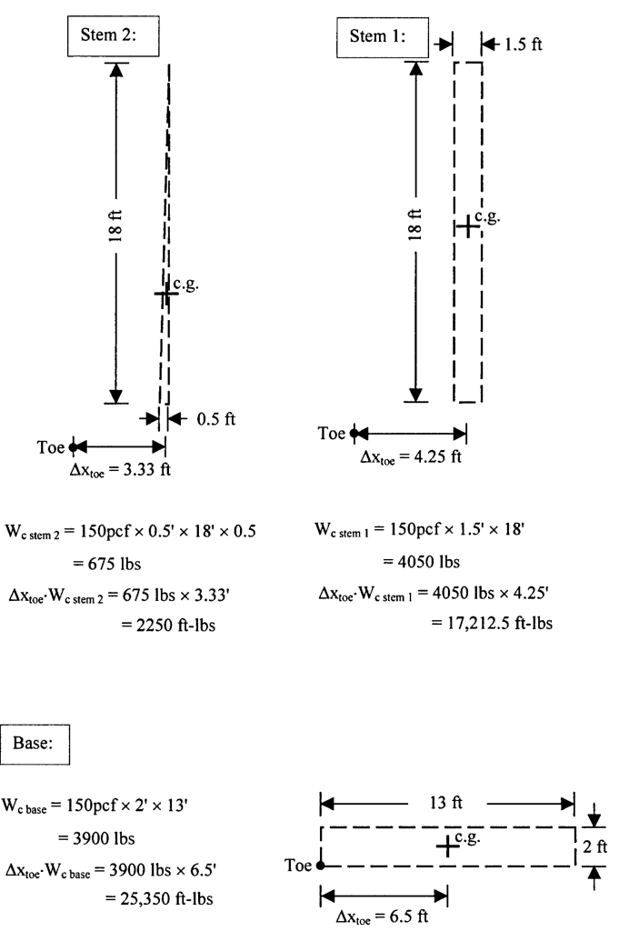 At this point we need to make one correction to the Corps’ work: the weights and moments are in pounds per unit length of wall and ft-pounds per unit length of wall, respectively. Leaving those per unit length designations is a common shortcut among practitioners but is confusing for students, who frequently find the unit length concept difficult to grasp at first. The weight of the backfill is properly 18,000 lbs/ft of wall and the moment around the toe ((clockwise) is 162,000 ft-lbs/ft of wall.