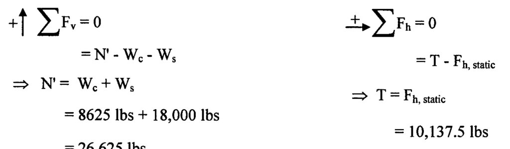 At this point we can compute the forces on the base (both the forces T’ and N’ and the location of the resultant xN’,) which are shown below.
