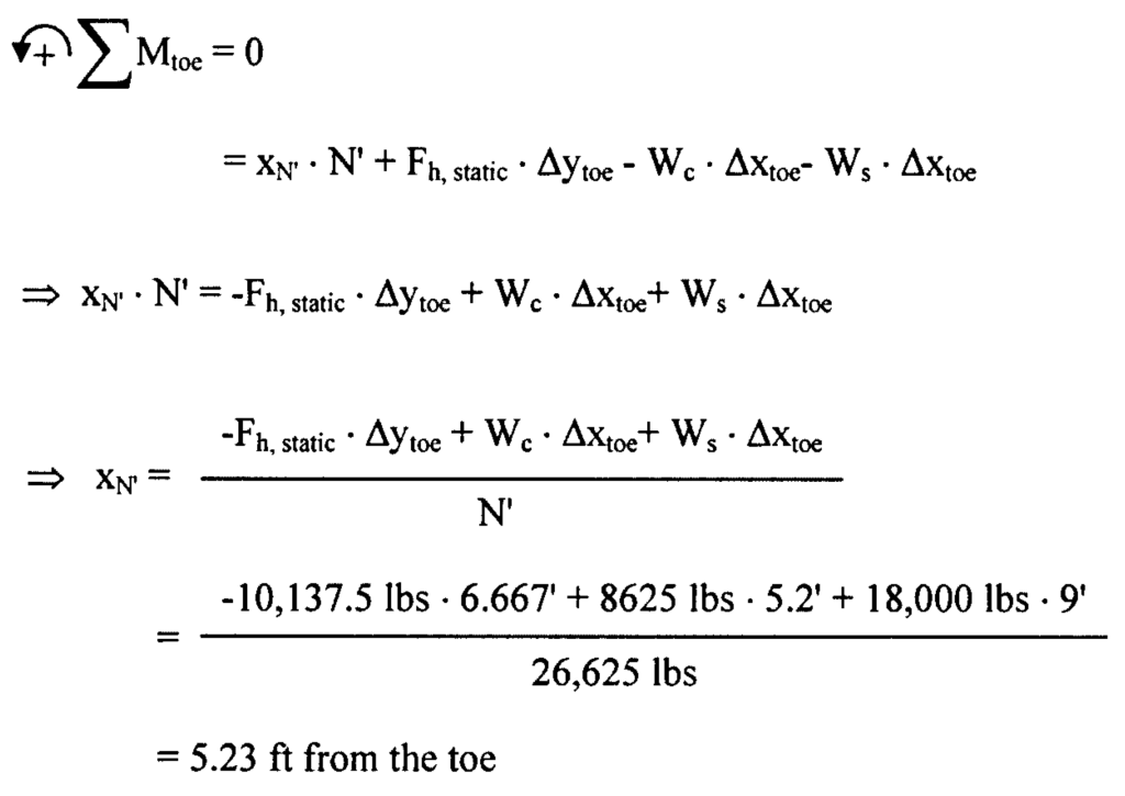 Taking all of this information and processing it yields the total weight, total moment around the toe, and moment arm around the toe: