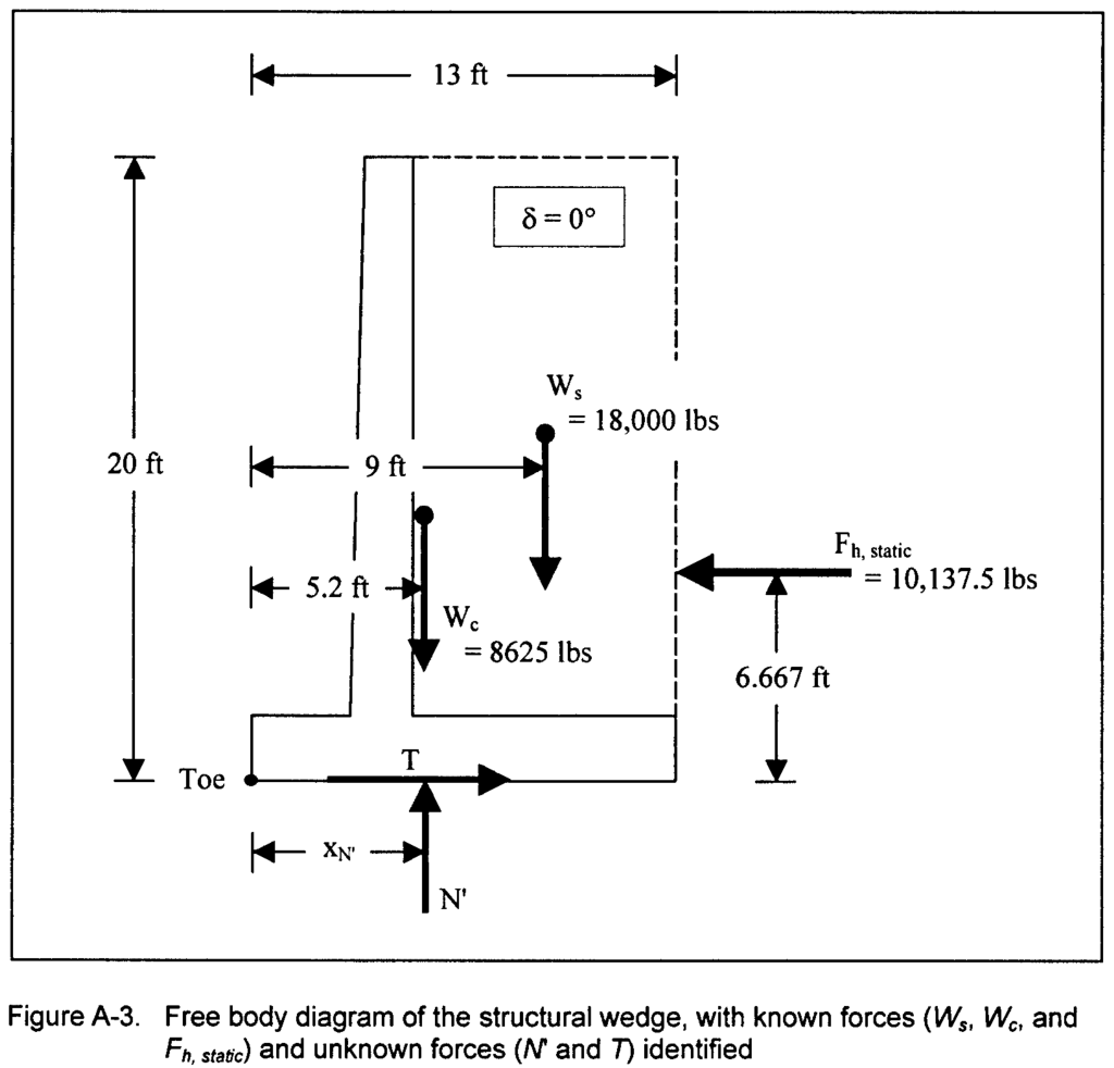 The methodology is based on the aforementioned Retaining and Flood Walls and the example (which is a little clearer description of same) comes from Appendix A of Seismic Analysis of Cantilever Retaining Walls, Phase I. I’ve modified it in a couple of spots and will detail those modifications as we go.
