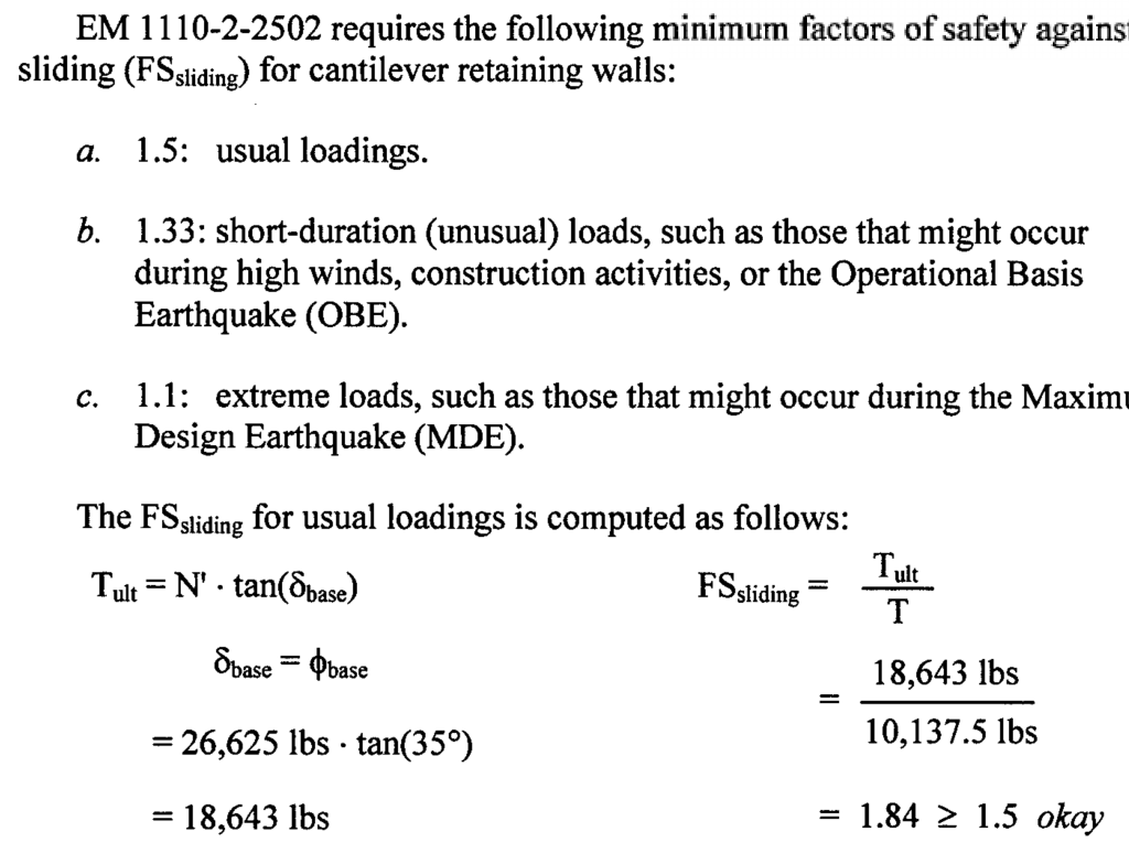 Turning to the sliding problem, the driving force is the earth pressure force and the resisting force is the maximum Coulomb friction of the base/soil interface. In this case the value of δ is equated to the unmodified value of φ’, although that isn’t always the case. (The basis for this is that there is a thin layer of backfill sand under the wall, under which is a different foundation soil.) We then apply Equation (1) and determine the factor of safety against sliding, which checks out against the Corps criteria.