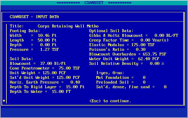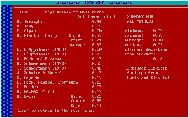 With that out of the way, the best way to illustrate the use of Hough’s Method is using a worked example, in this case a retaining wall foundation from A Simplified Method to Design Cantilever Gravity Walls. The diagram at the top of the page shows the foundation; the settlement calculations for a variety of methods (using the U.S. Army Corps of Engineers’ CSANDSET program) are given there. Let’s begin by reproducing those results below.