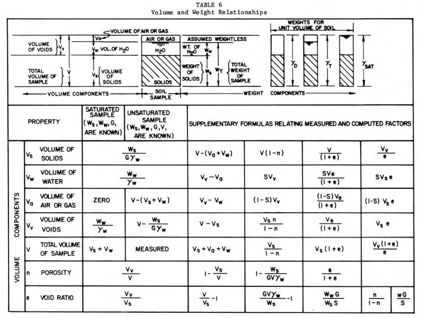 Over the years, student and practitioner alike have to deal with weight and volume relationships in soils and the dimensionless constants (water content, void ratio, porosity, degree of saturation and so forth.) There are many different “cheat sheets” dealing with this, but the best one IMHO is the one from NAVFAC DM 7, presented below.