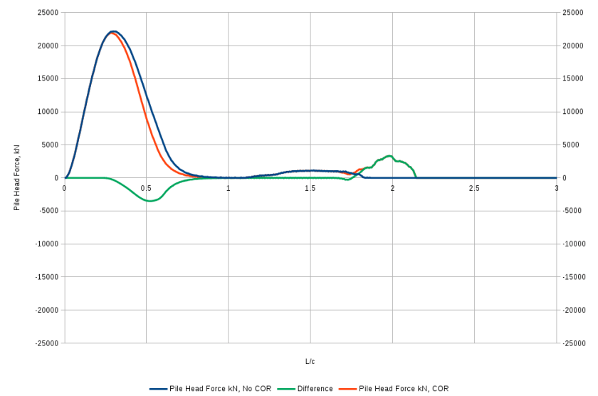 The pile head force until peak was identical, and then decreased more rapidly afterwards. There was an additional “kick” at 2L/c not present in the previous run.